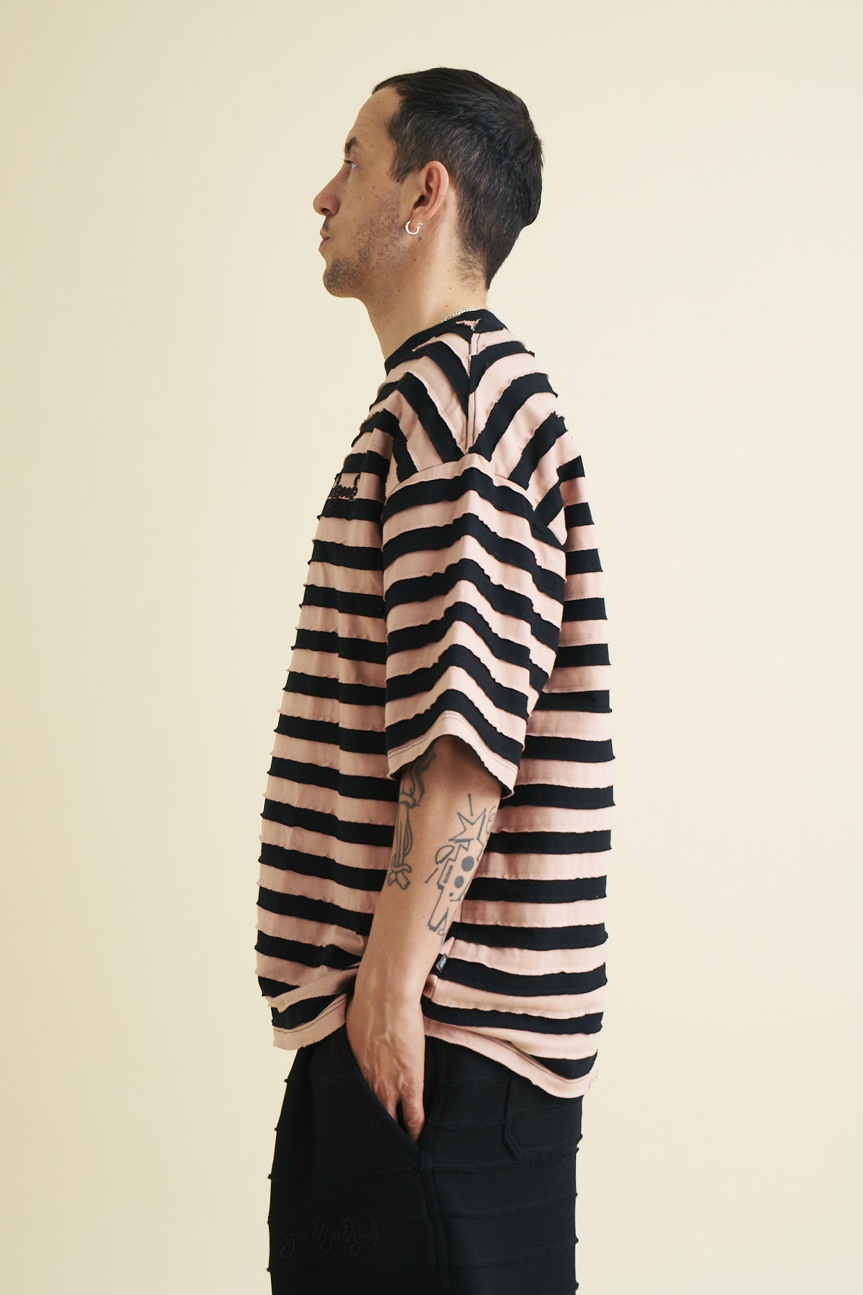 The Strip-Stripe T-Shirt is Good Good Good’s newest solution that they have developed to work with the offcuts produced from the regular T-shirt production runs at their 30-year-old heritage manufacturing facility in Woodstock, Cape Town. The manufacturing process behind this T-shirt is arduous. With meticulous attention to detail, offcuts are selected by hand and cut down to strips. Strips need to be sewn together two at a time, then ironed straight, before being added to the rest of the strips. Eventually, the sheet of Strip-Stripe fabric is large enough to cut the panels of the T-shirt from.