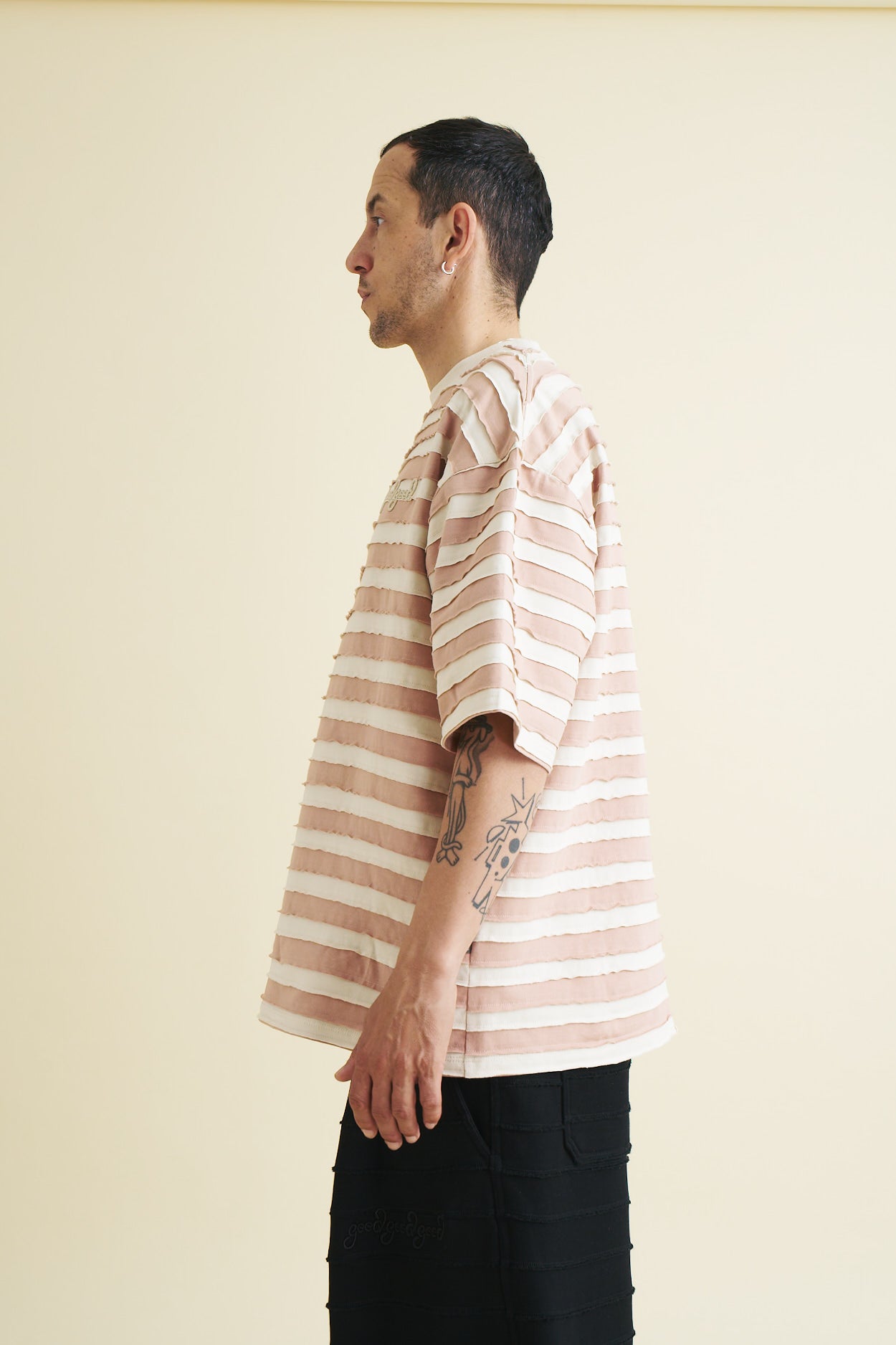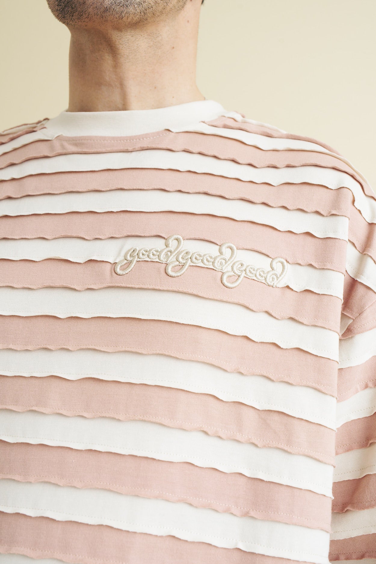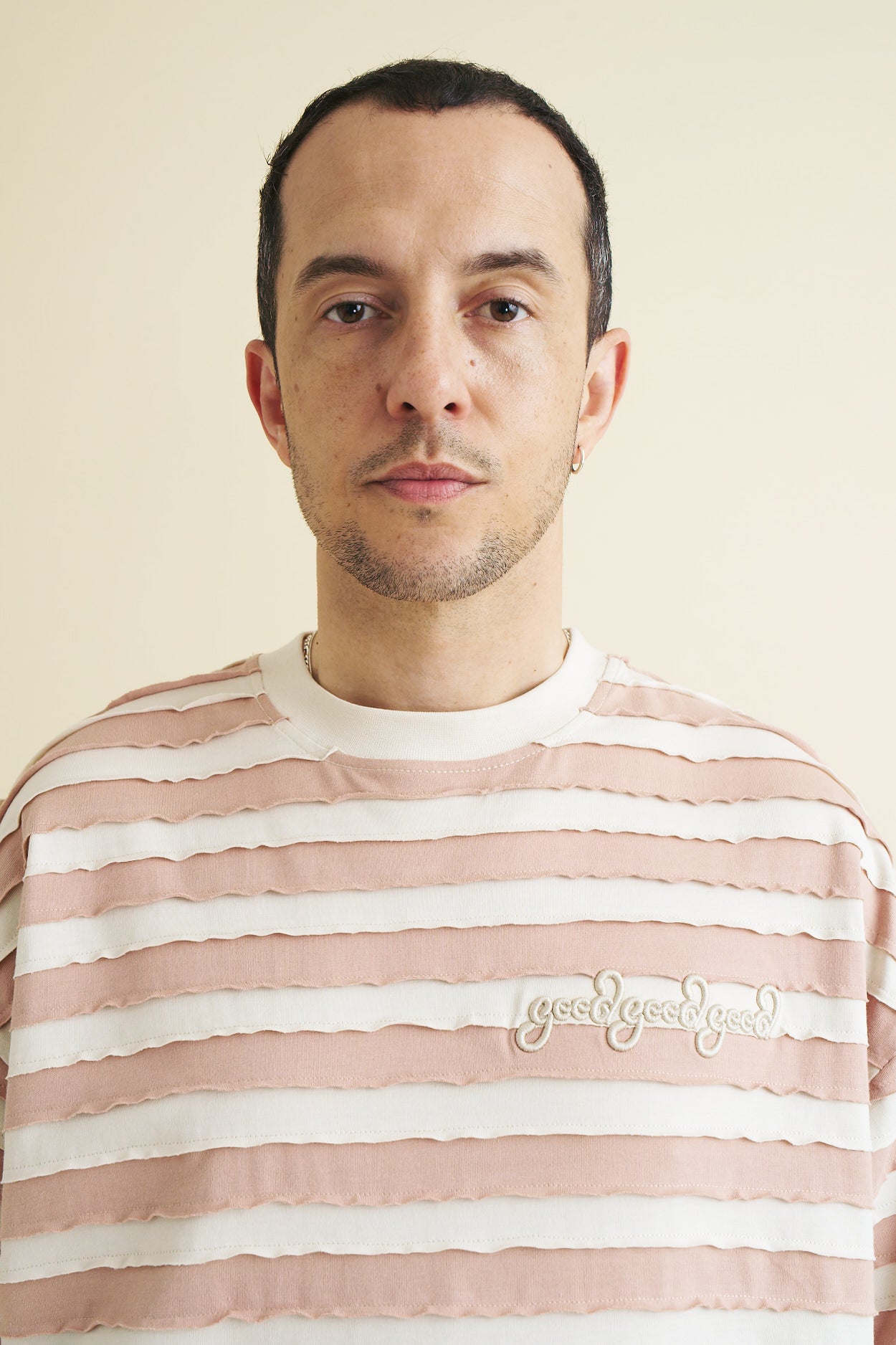 The Strip-Stripe T-Shirt is Good Good Good’s newest solution that they have developed to work with the offcuts produced from the regular T-shirt production runs at their 30-year-old heritage manufacturing facility in Woodstock, Cape Town. The manufacturing process behind this T-shirt is arduous. With meticulous attention to detail, offcuts are selected by hand and cut down to strips. Strips need to be sewn together two at a time, then ironed straight, before being added to the rest of the strips. Eventually, the sheet of Strip-Stripe fabric is large enough to cut the panels of the T-shirt from.