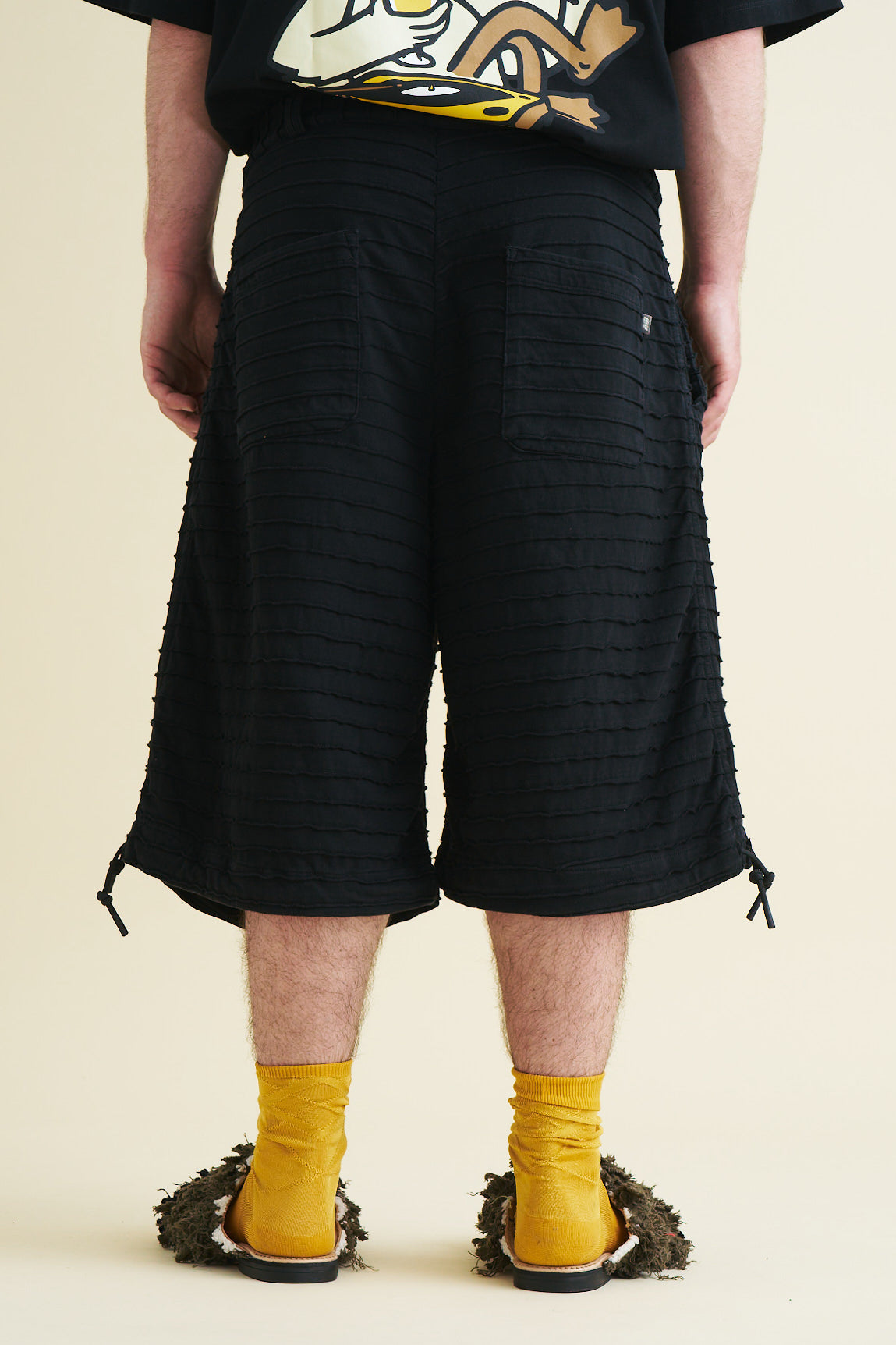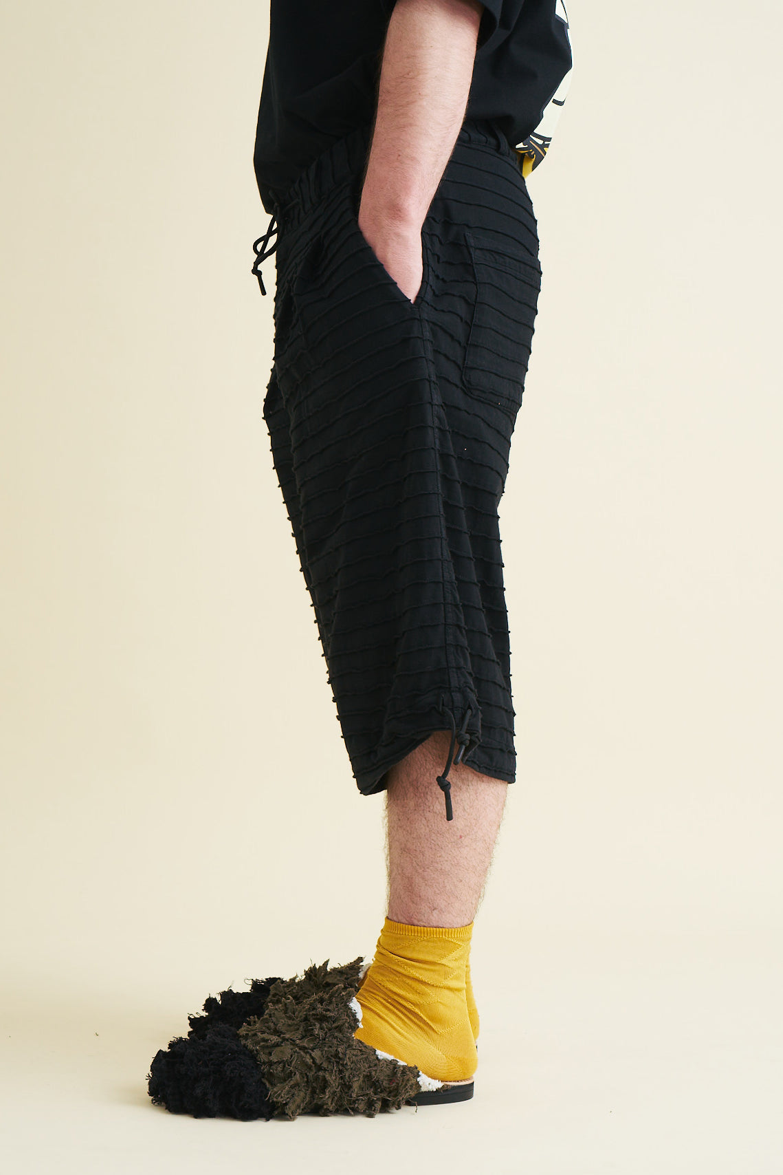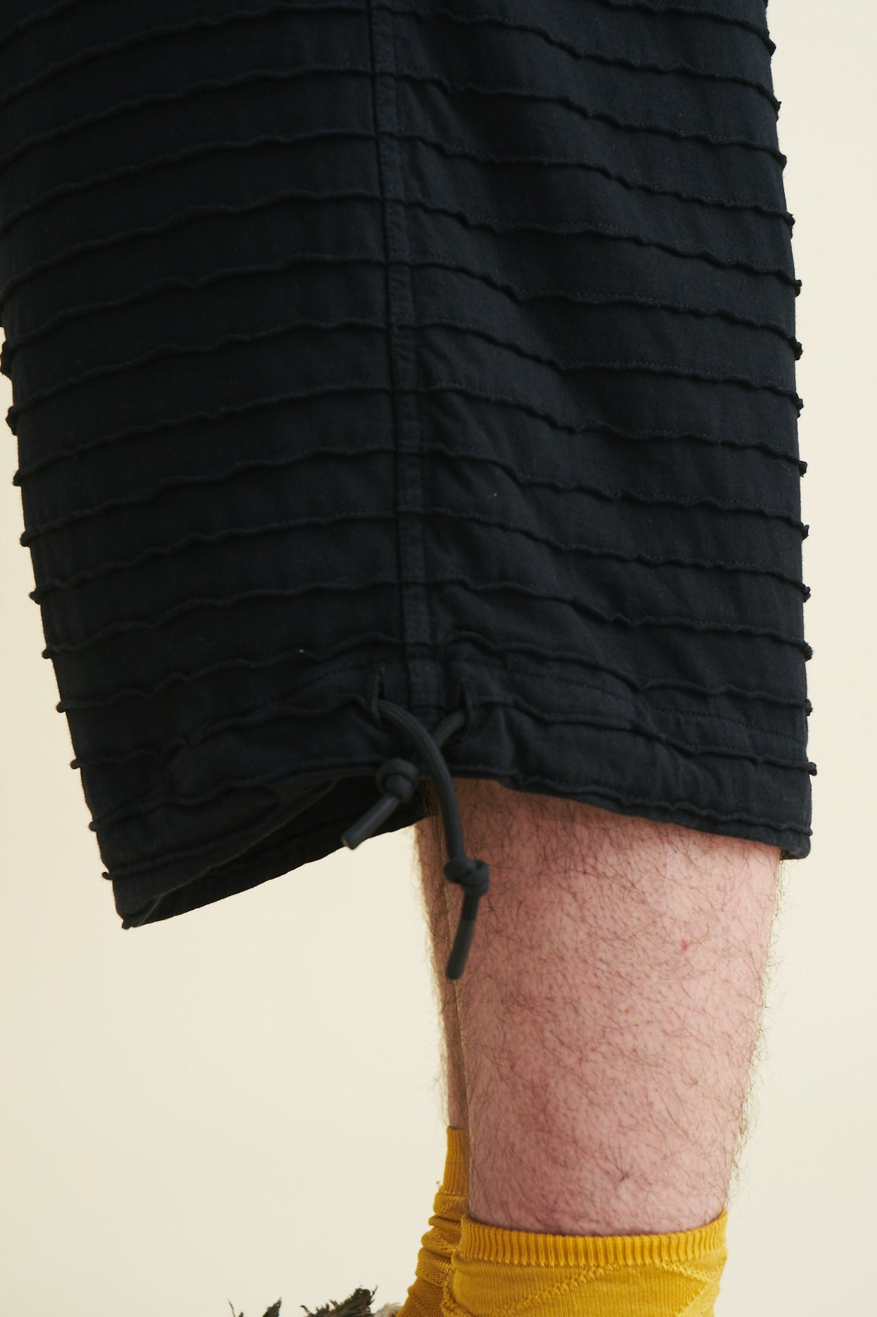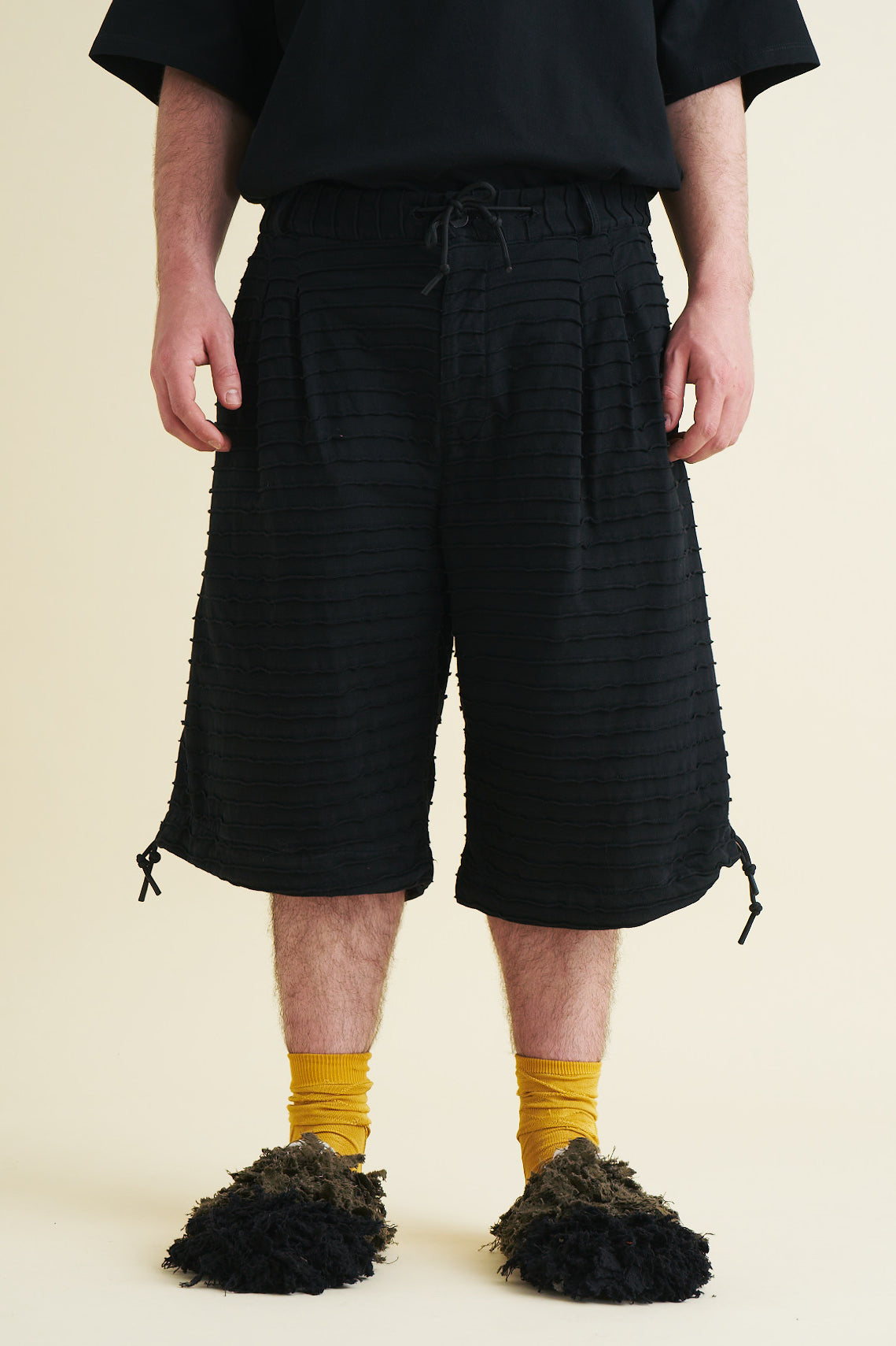 The shorts have a soft feel and a flowy, draping shape, with the legs extending to just below the knee. They are finished with belt loops and a drawstring at the waistband, as well as a button and YKK-zip closure. The shorts also feature adjustable drawstrings at the hems of both legs which make the shape of the shorts customizable to the wearer.