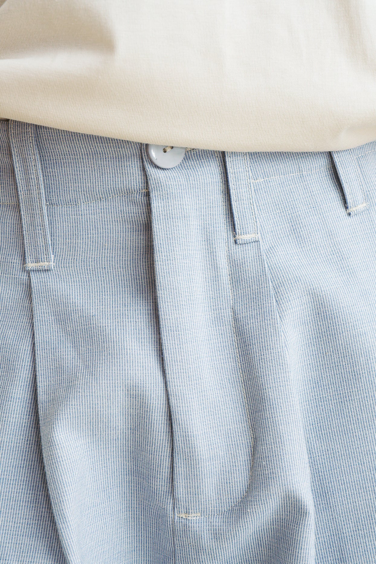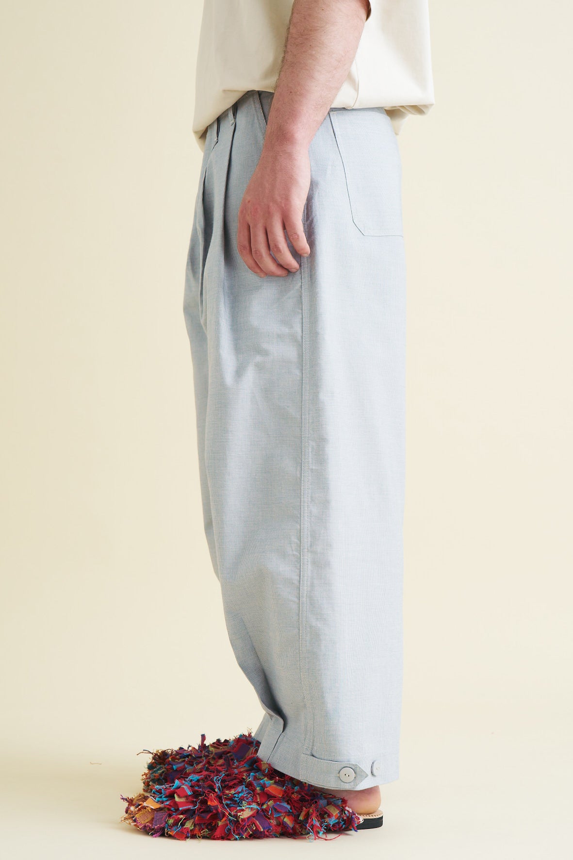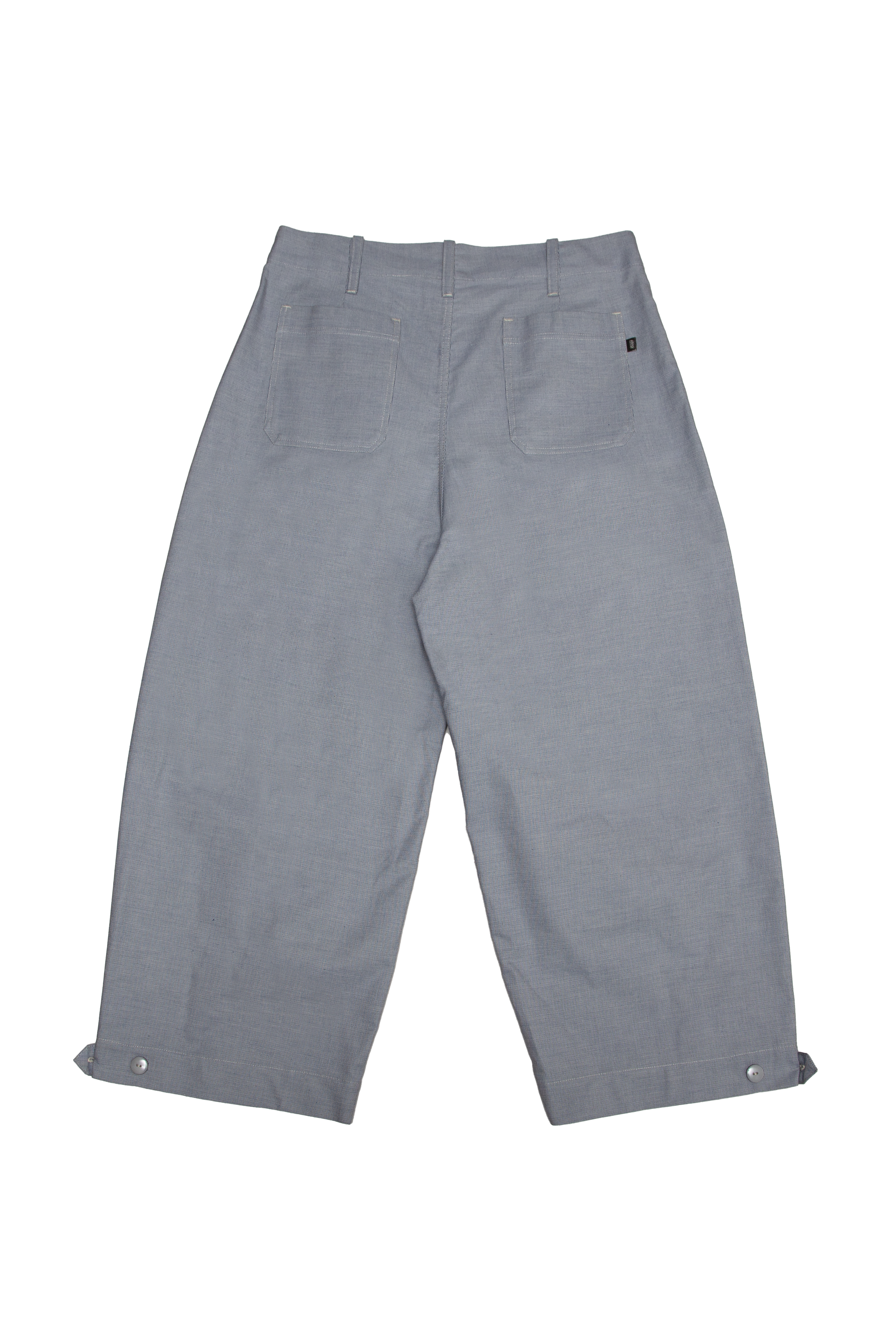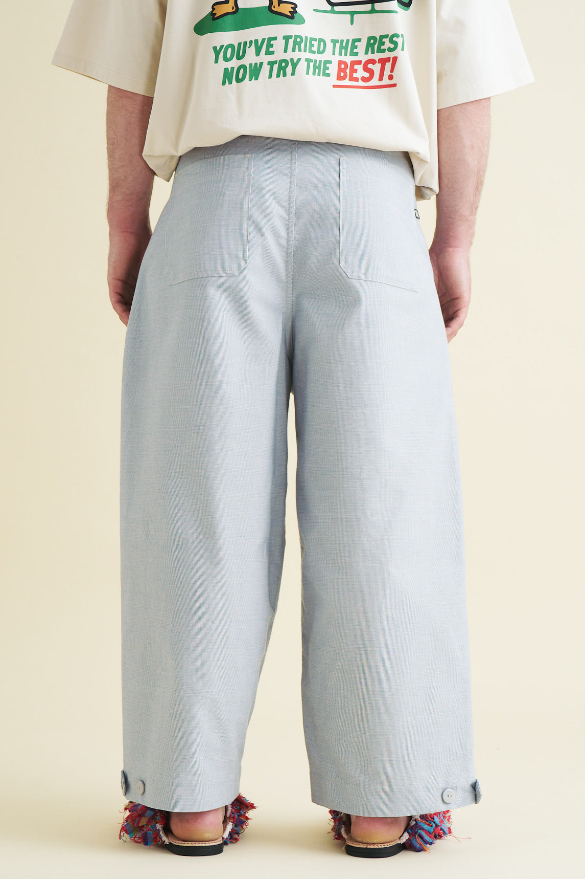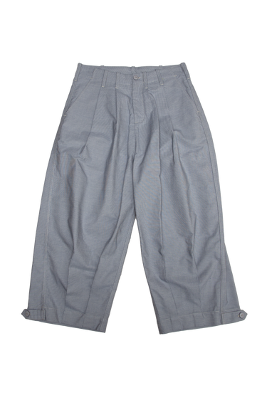 The Balloon Trousers is Good Good Good’s most popular wide-legged bottoms silhouette, with 4 pleats in the front and two darts in the back, making them flare out from the waist. The hems on the legs of the trousers are pleated, tapering the trousers near the ankle.