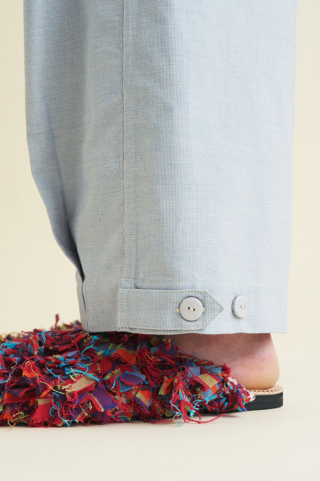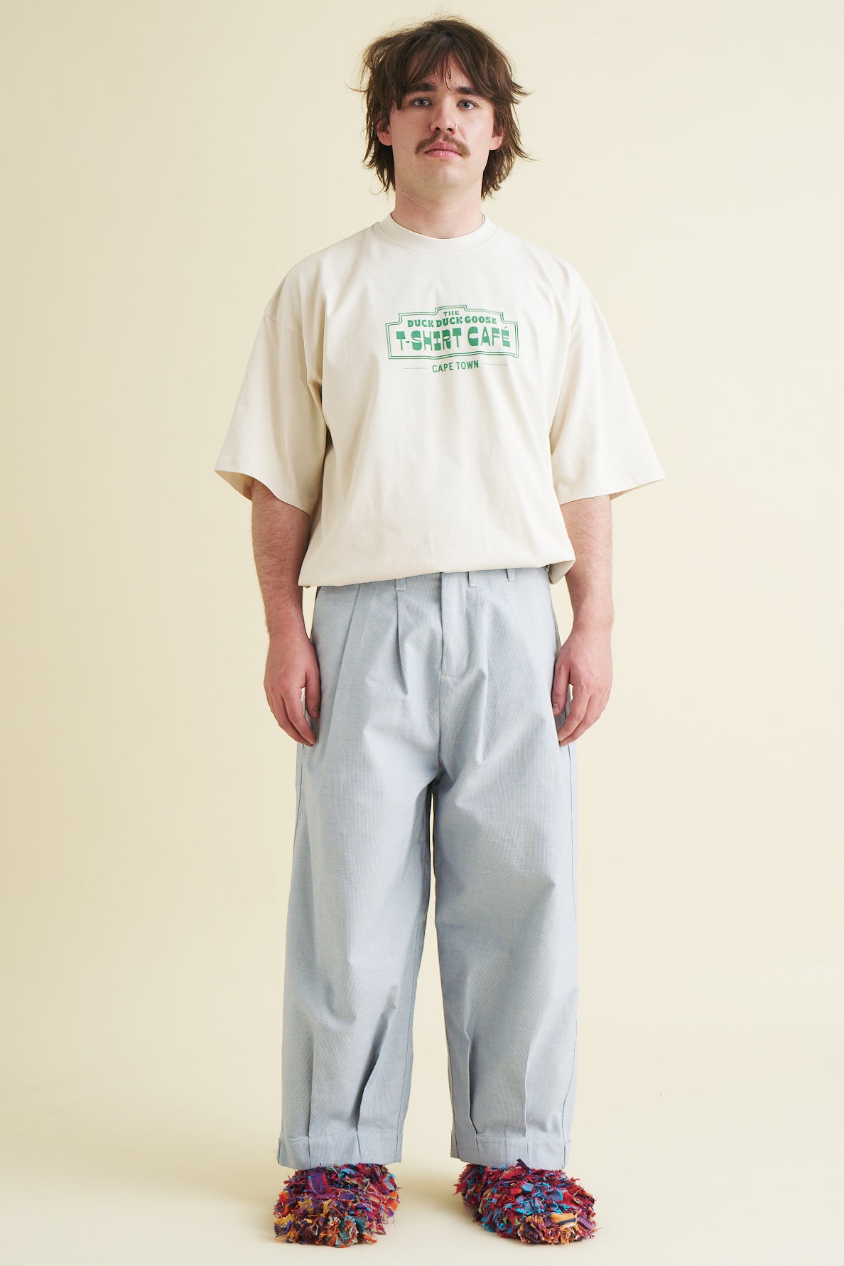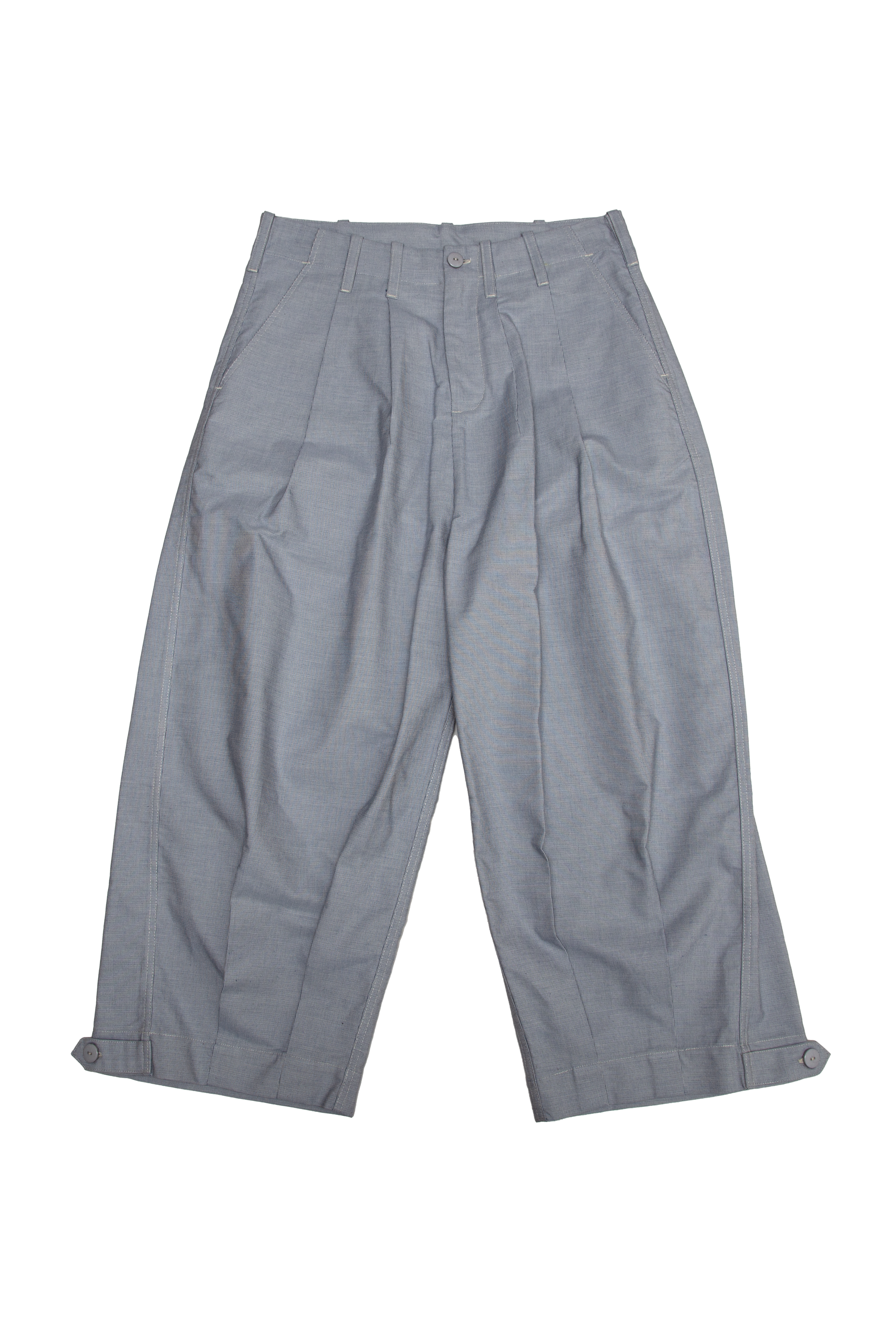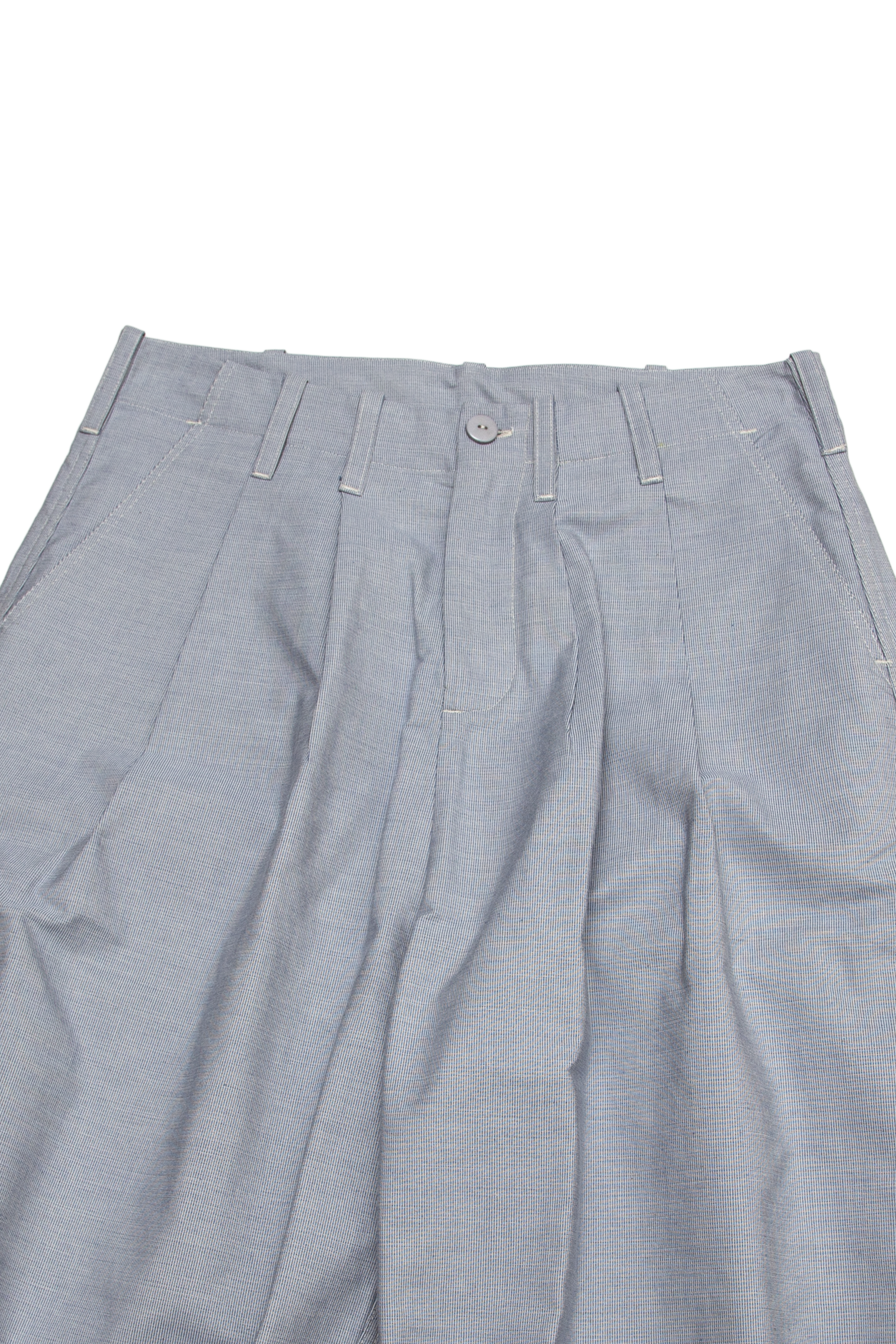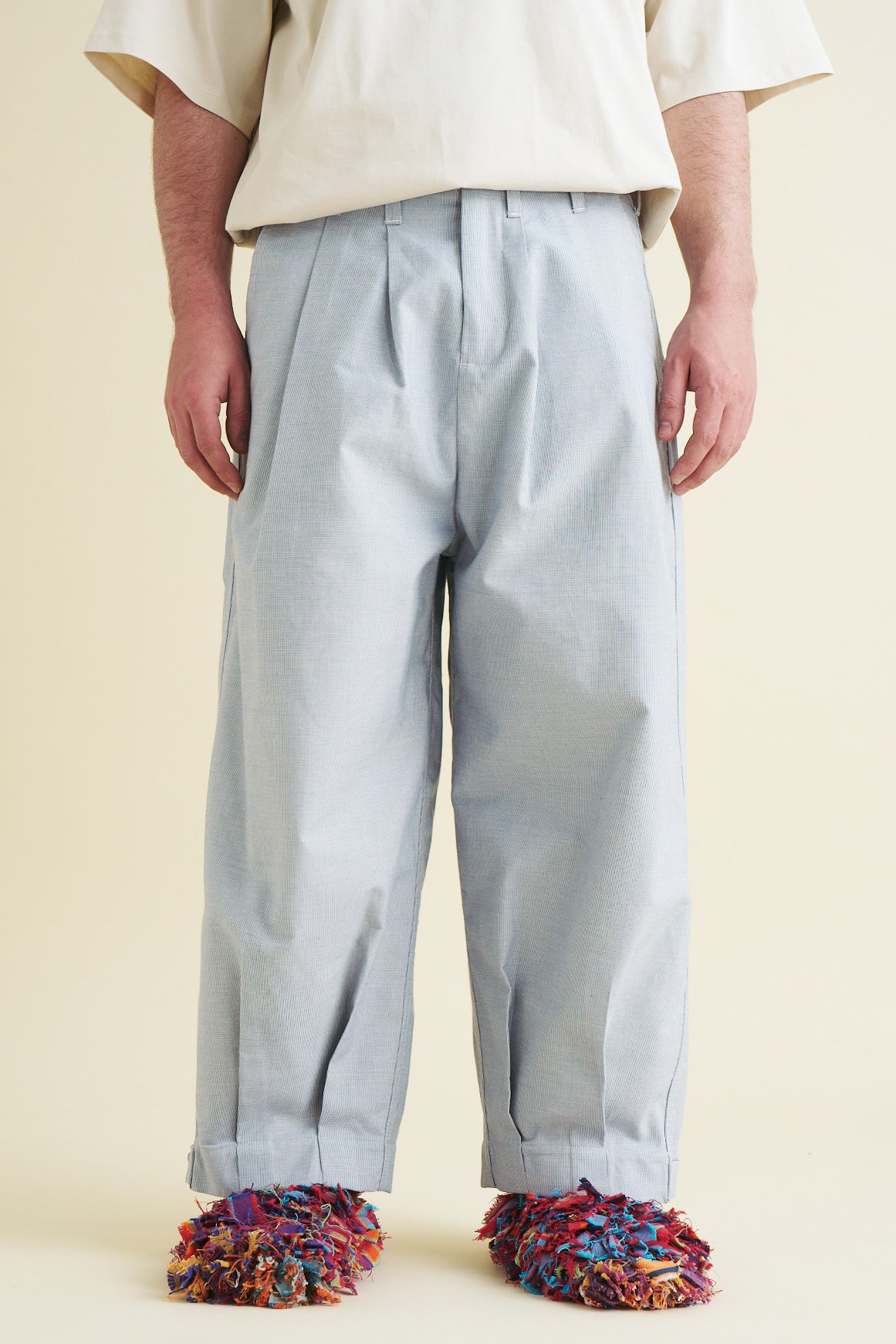 The Balloon Trousers is Good Good Good’s most popular wide-legged bottoms silhouette, with 4 pleats in the front and two darts in the back, making them flare out from the waist. The hems on the legs of the trousers are pleated, tapering the trousers near the ankle.
