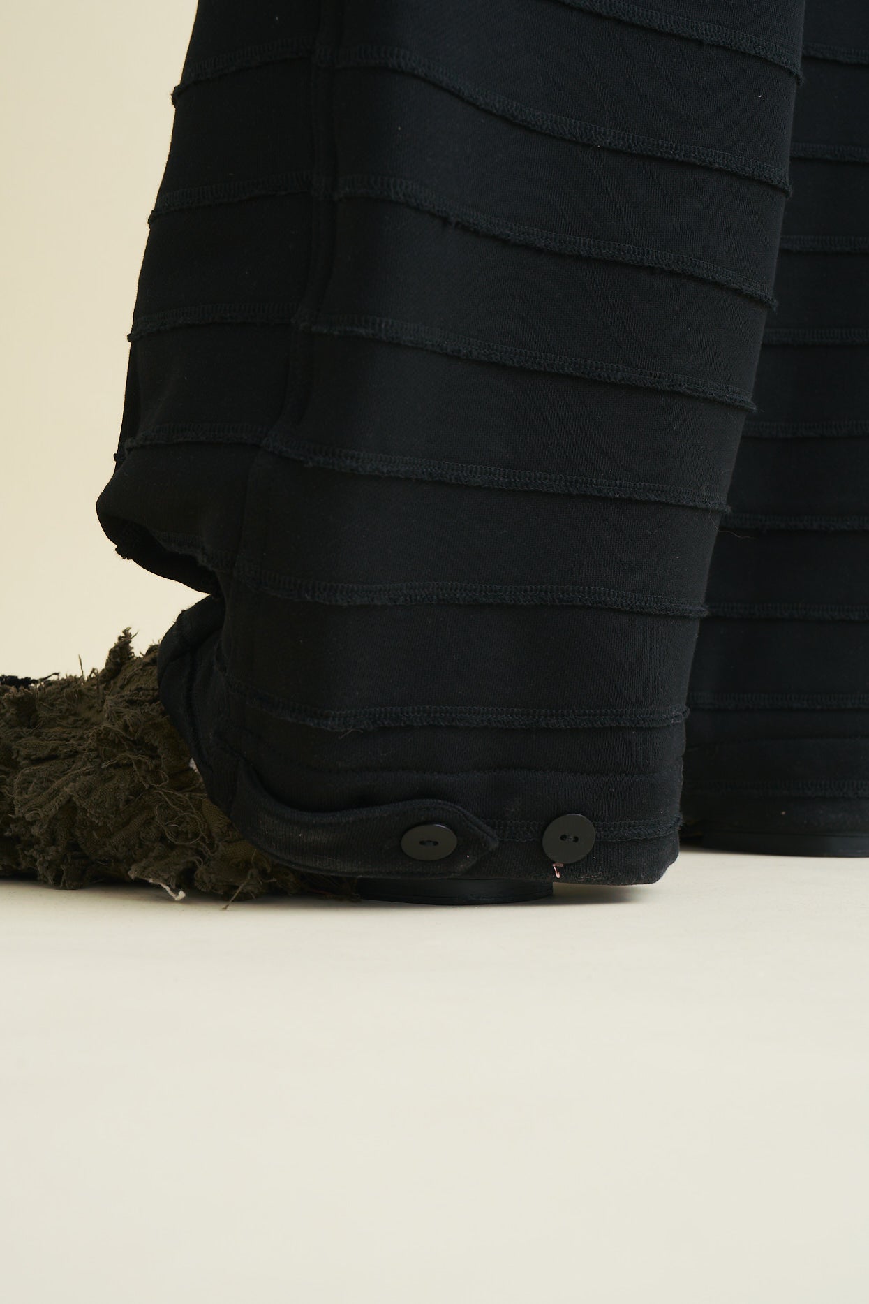 - The hems on the legs of the trousers are pleated, tapering the trousers near the ankle, with 2 fastening options at the hems