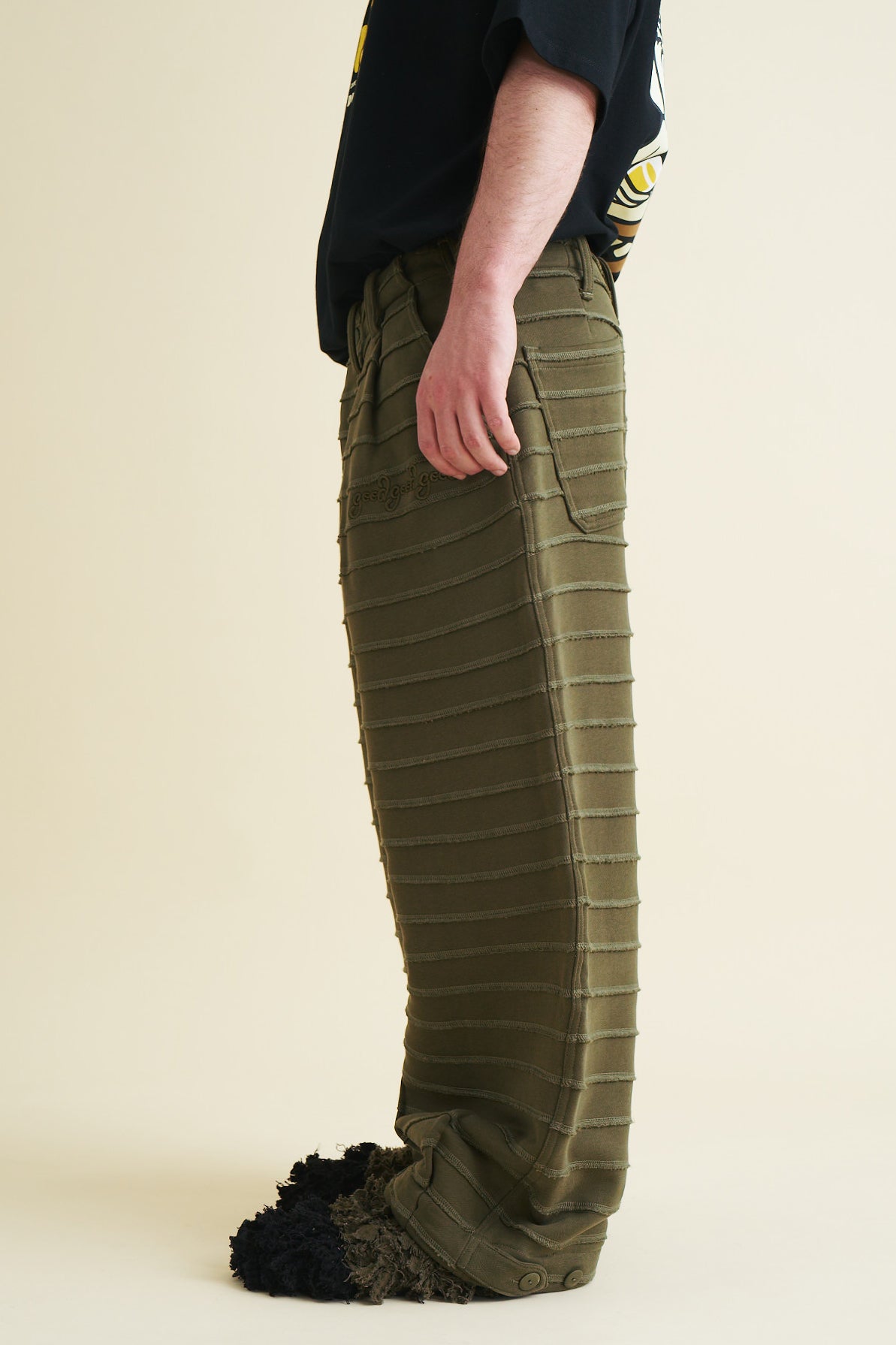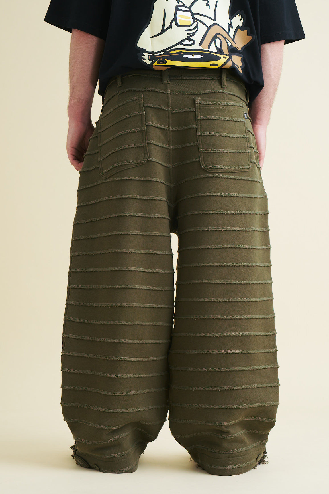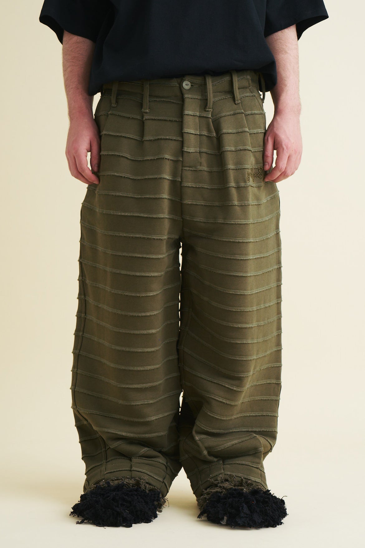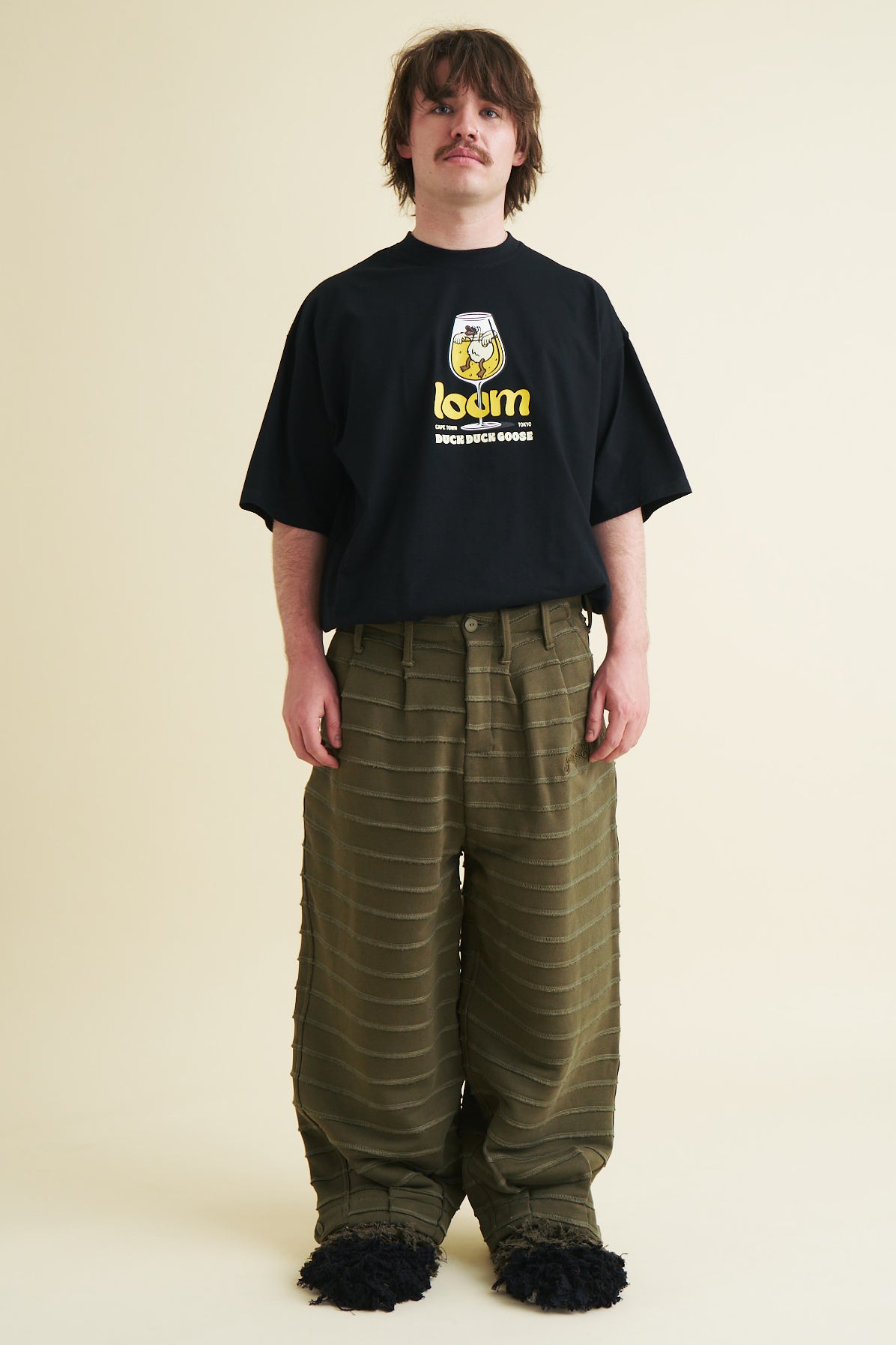 The Strip-Stripe Balloon Trousers form part of Good Good Good’s greater Strip-Stripe Capsule, the brand’s newest solution that they have developed to work with the offcuts produced from regular T-shirt and fleece production runs at their 30-year-old heritage manufacturing facility in Woodstock, Cape Town. The manufacturing process behind this garment is arduous. With meticulous attention to detail, offcuts are selected by hand and cut down to strips. Strips need to be sewn together two at a time, then ironed straight, before adding any more. Eventually, the sheet of Strip-Stripe fabric is large enough to cut the panels of the trousers from.