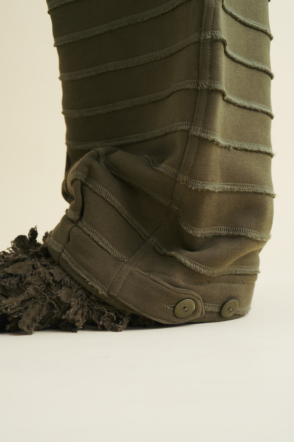 - The hems on the legs of the trousers are pleated, tapering the trousers near the ankle, with 2 fastening options at the hems