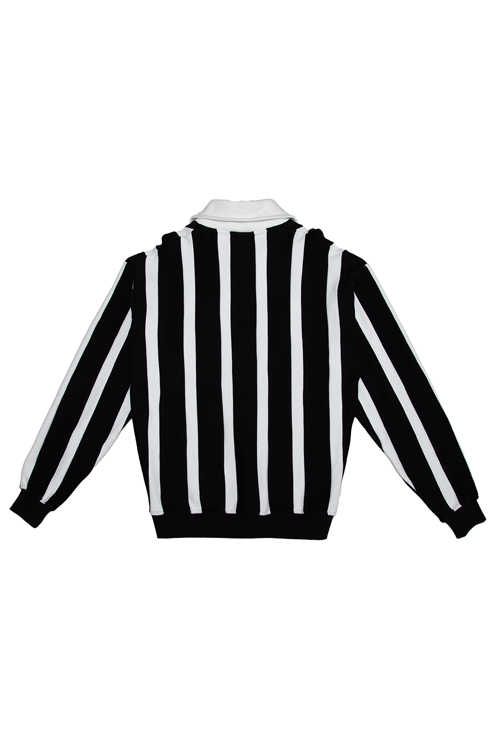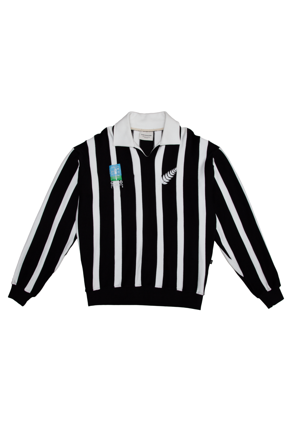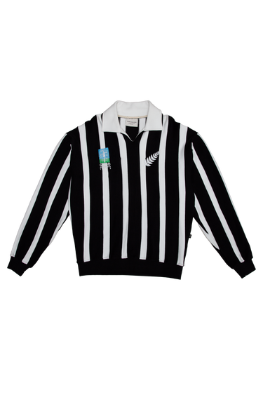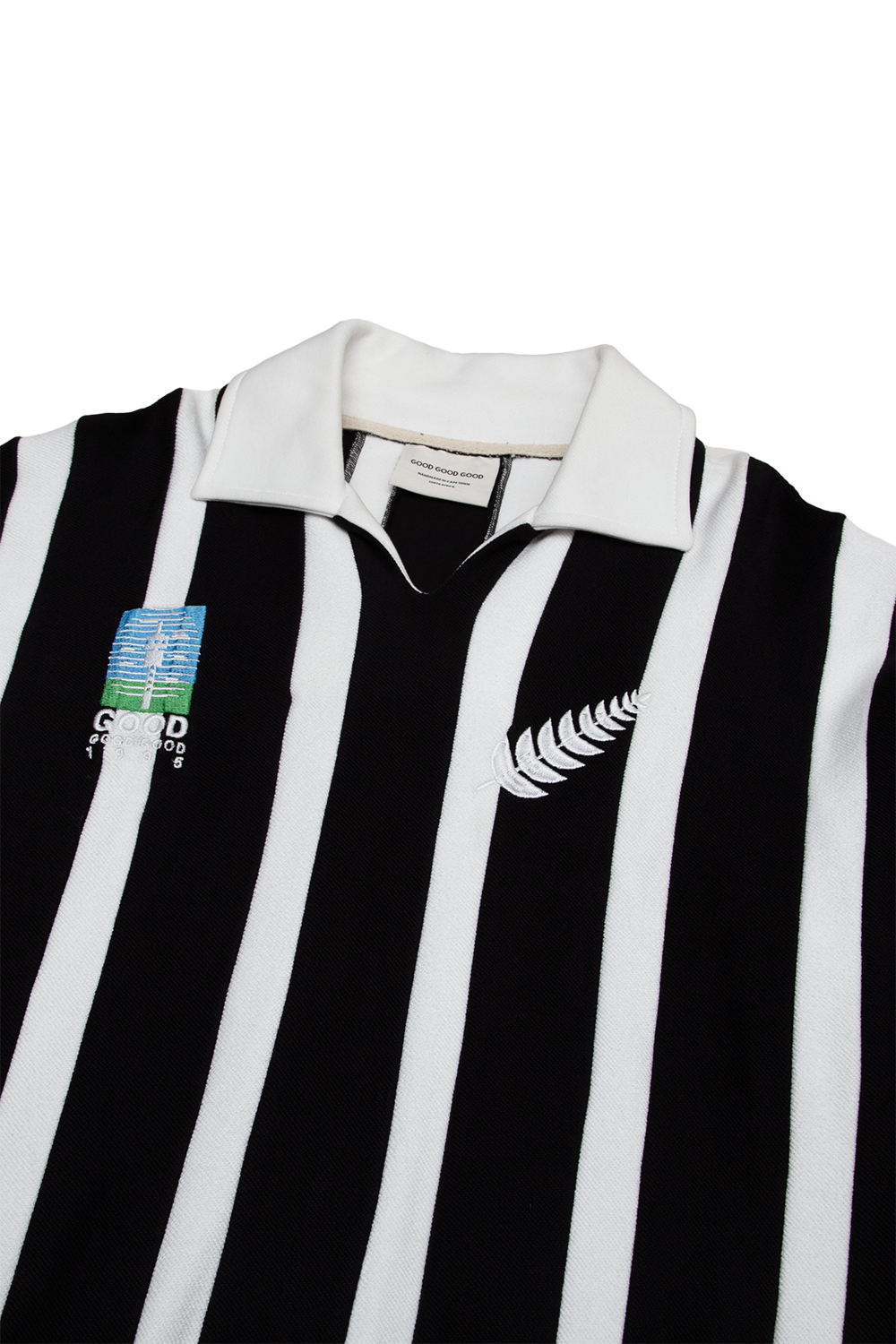 The collared sweater forms part of Good Good Good’s ‘Unsung Heroes’ Capsule Collection, which pays tribute to the Springboks’ 1995 Rugby World Cup victory. The jersey features construction techniques borrowed from the brand’s Strip-Stripe Capsule, where offcuts are selected by hand and cut down to strips, before being sewn together two at a time, then ironed straight, before adding any more. Eventually, the sheet of Strip-Stripe fabric is large enough to cut the panels of the sweater from. This jersey is inspired by the colours of the 1995 All Black rugby kit, and features embroideries of a silver fern-inspired emblem and Good Good Good’s RWC logo, all illustrated by Yay Abe