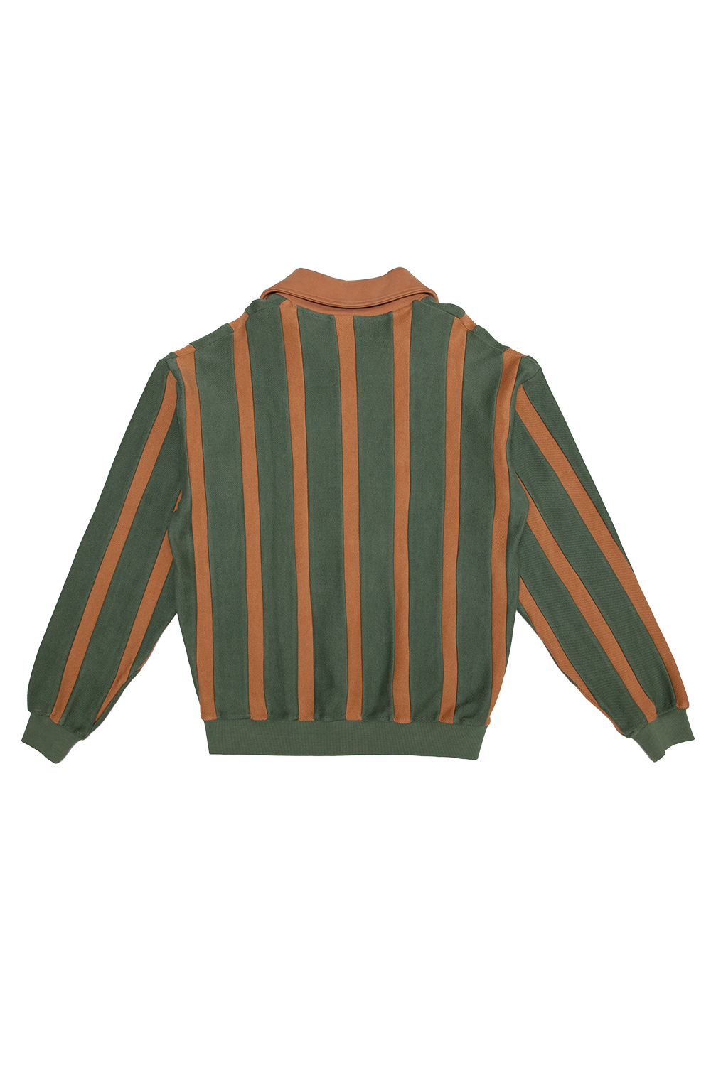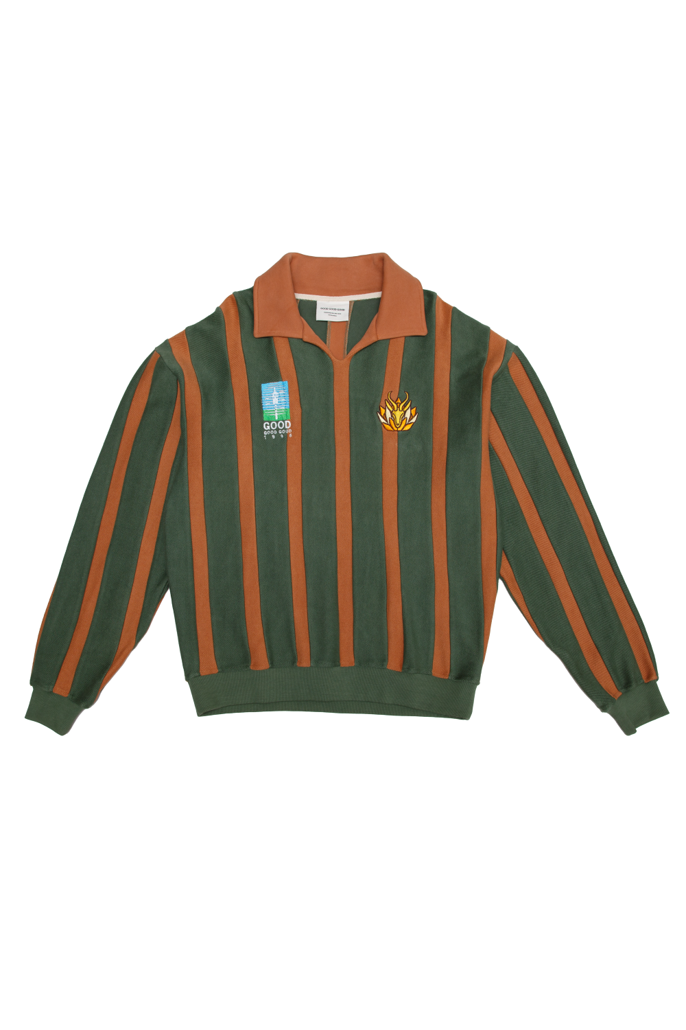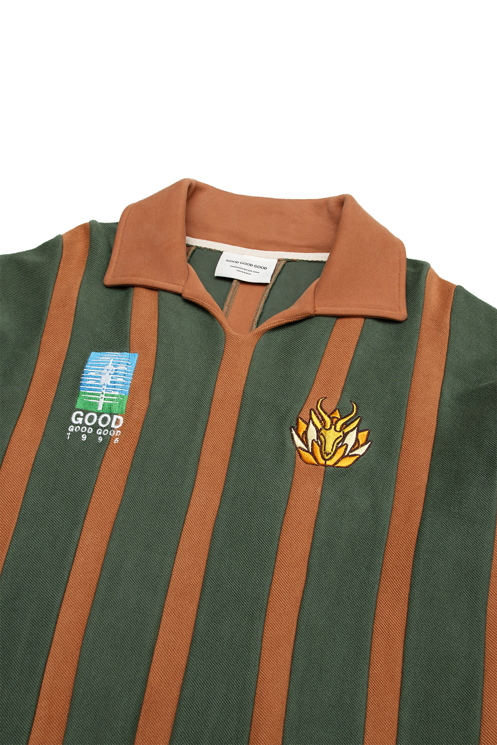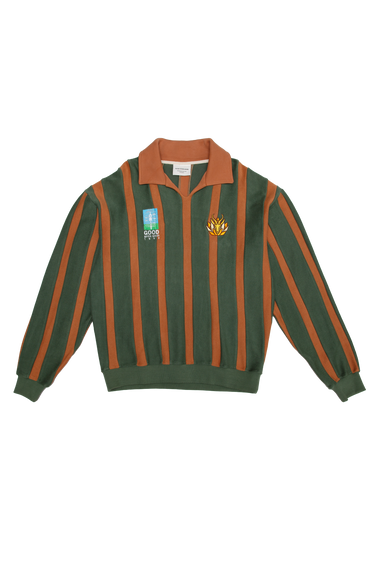 The collared sweater forms part of Good Good Good’s ‘Unsung Heroes’ Capsule Collection, which pays tribute to the Springboks’ 1995 Rugby World Cup victory. The jersey features construction techniques borrowed from the brand’s Strip-Stripe Capsule, where offcuts are selected by hand and cut down to strips, before being sewn together two at a time, then ironed straight, before adding any more. Eventually, the sheet of Strip-Stripe fabric is large enough to cut the panels of the sweater from. This jersey is inspired by the colours of the 1995 Springbok rugby kit, and features embroideries of a springbok-inspired emblem and Good Good Good’s RWC logo, all illustrated by Yay Abe.
