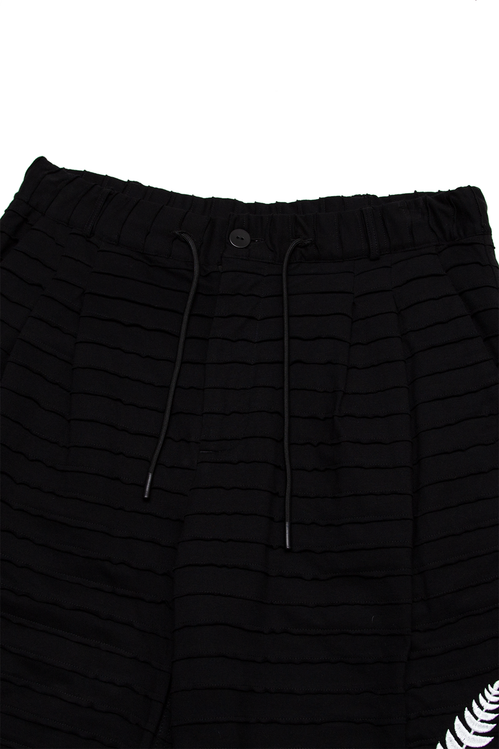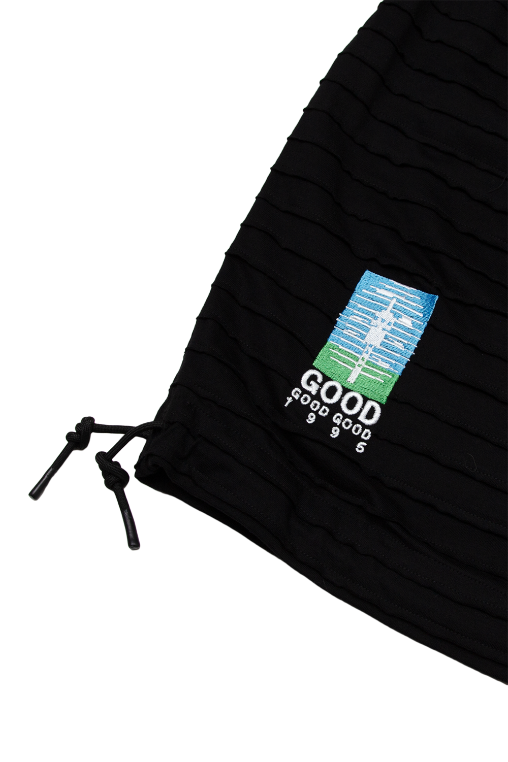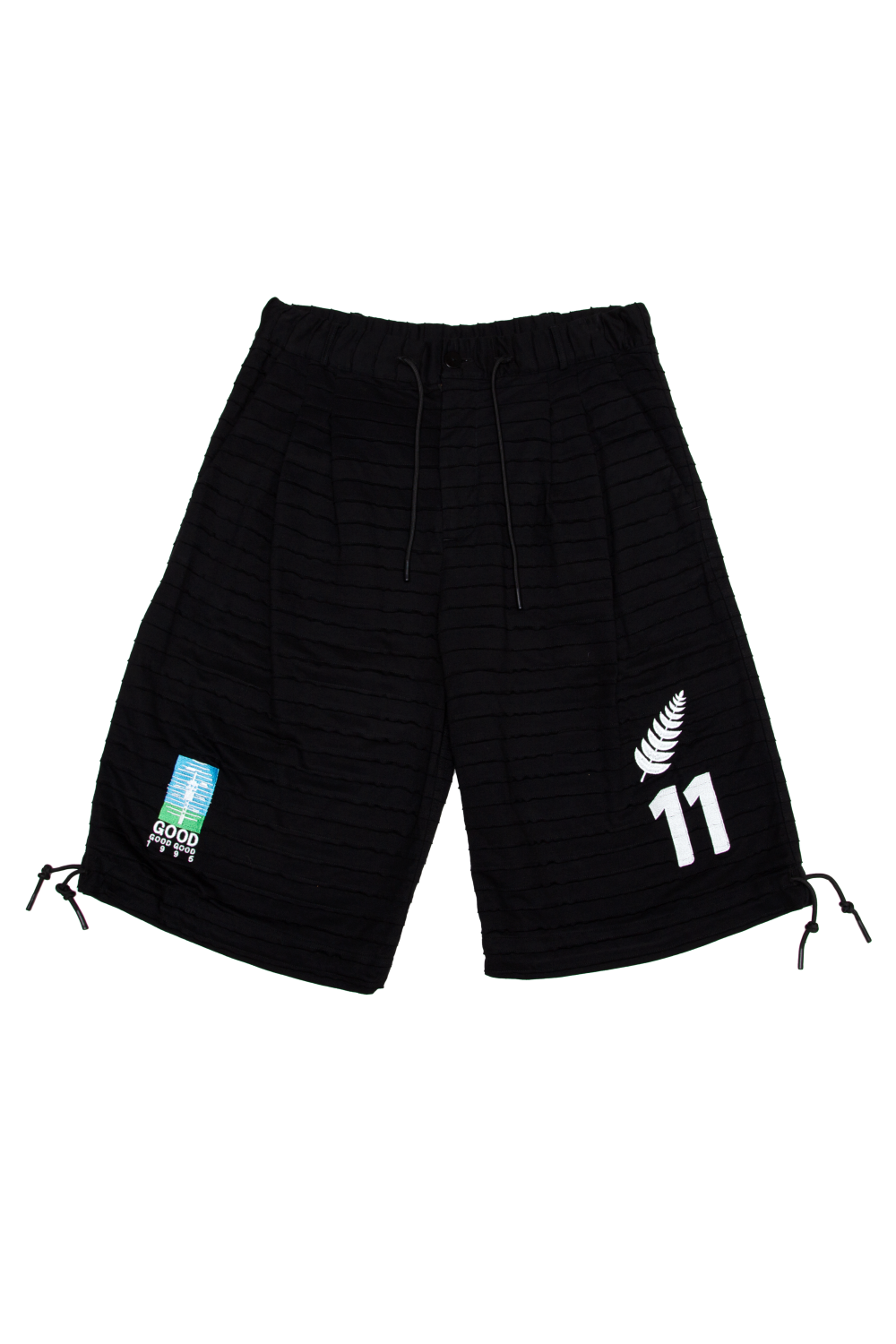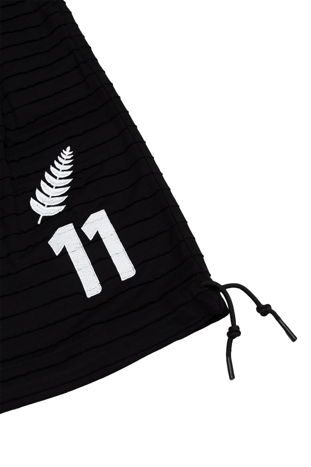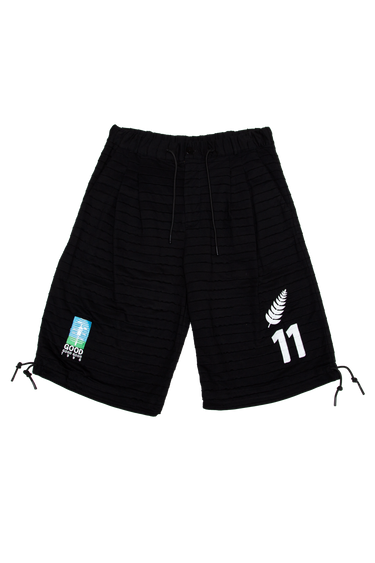 This pair of shorts forms part of Good Good Good’s ‘Unsung Heroes’ Capsule Collection, which pays tribute to the Springboks’ 1995 Rugby World Cup victory. This patchwork short is made from 100% Southern African-sourced cotton single jersey strips, inspired by the colours of the 1995 New Zealand rugby kit. Embroideries on the knee regions including Jonah Lomu’s number 11, a silver fern-inspired emblem and Good Good Good’s RWC logo, all illustrated by Yay Abe. The shorts are finished with belt loops and a drawstring at the waistband, as well as a button and YKK-zip closure. The shorts also feature adjustable drawstrings at the hems of both legs which make the shape of the shorts customizable to the wearer.