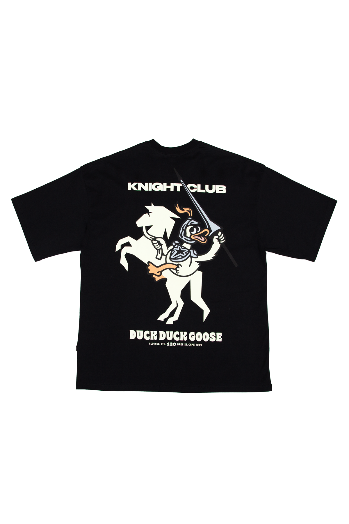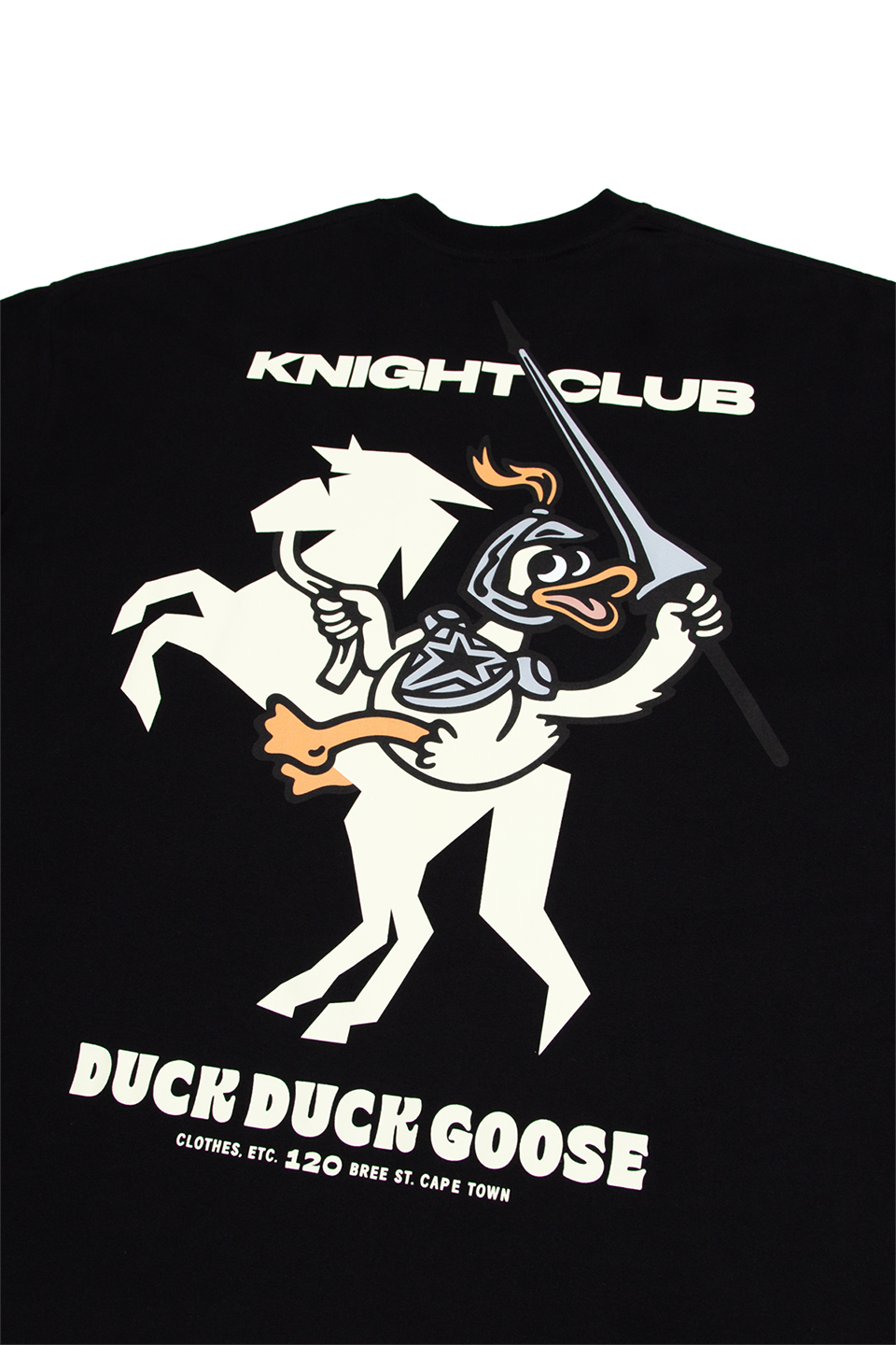 This T-shirt is a collaboration with London-based chess club, Knight Club, who hosted a pop-up chess activation at our 120 Bree Street store in January 2026. The T-shirt features screenprinted artworks by Shaun Hill, depicting duck and goose-shaped chess pieces on the front of the tee, and a duck knight riding a horse, Knight Club’s logo, on the back.