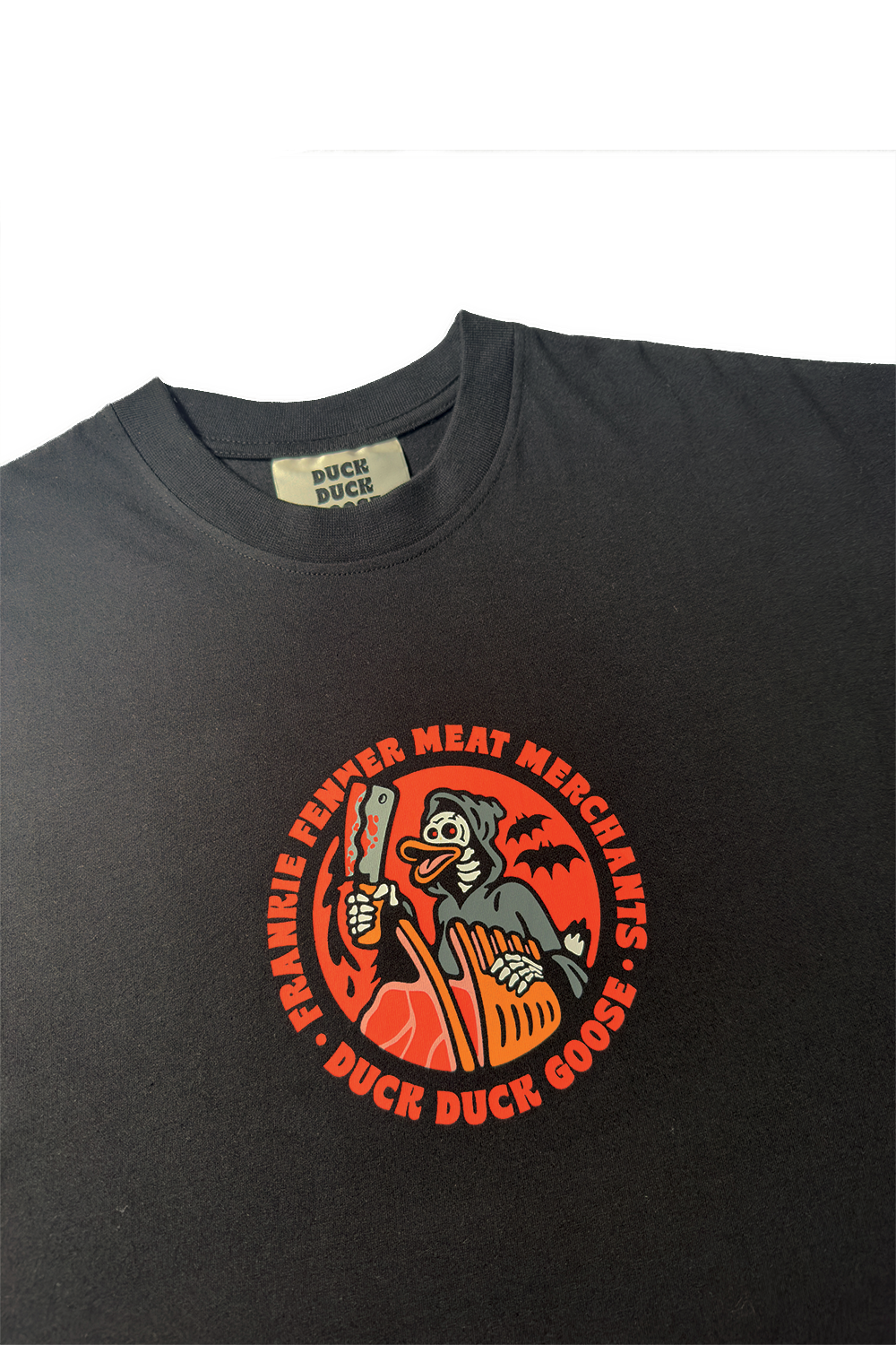 The FFMM Reaper Duck T-Shirt is our second collaborative T-shirt with Frankie Fenner Meat Merchants, whose Woodstock butchery is just around the corner from our 30-year-old heritage factory. To accompany this collaboration, we hosted a spooky-themed 5-course feast with the butchery at their Woodstock location for Halloween. The T-shirt features front and back screenprints of the Reaper Duck wielding a cleaver and a selection of FFMM signature meat cuts, illustrated by Shaun Hill.