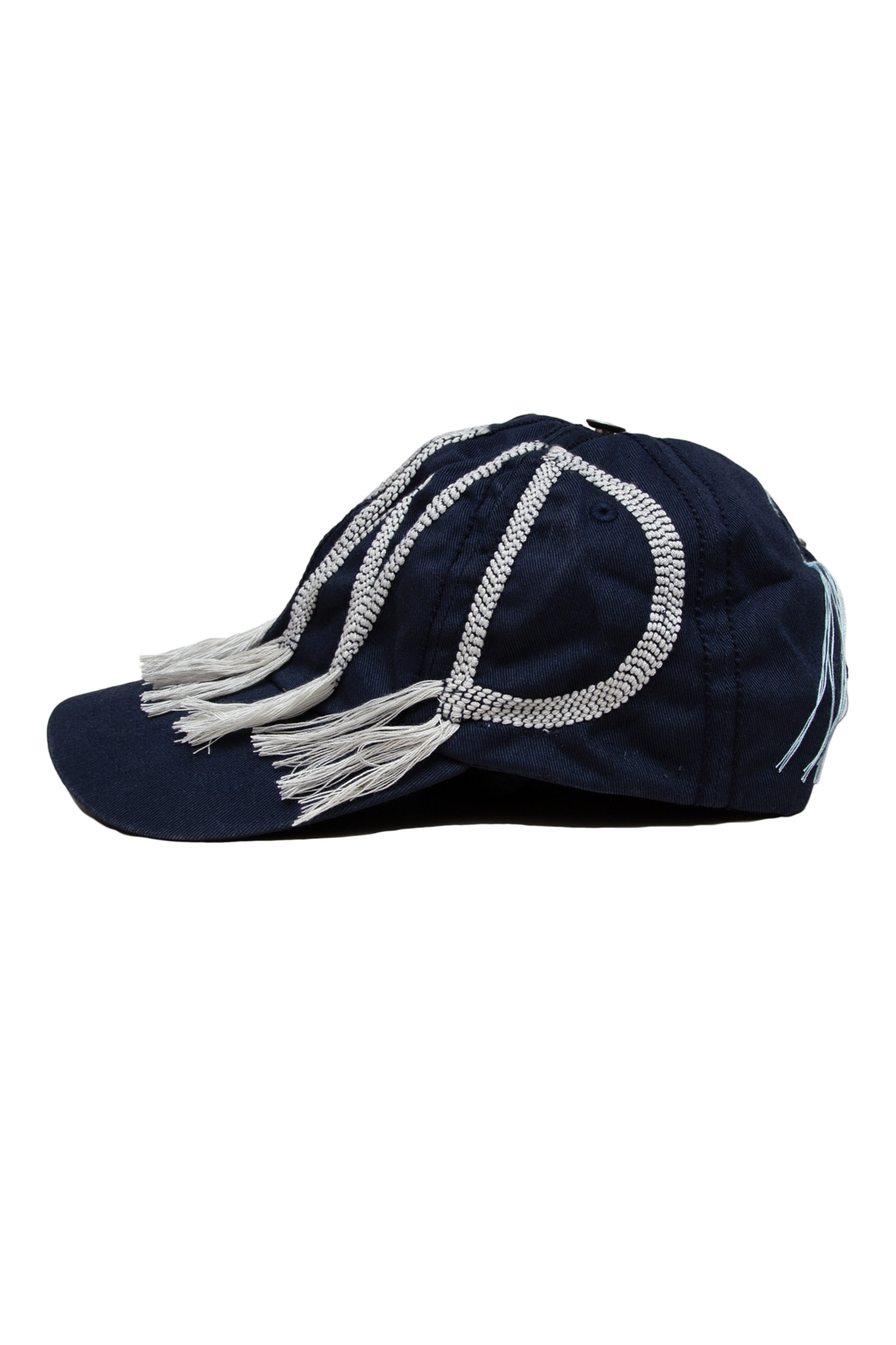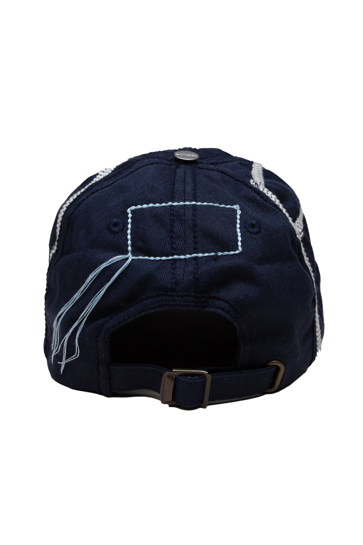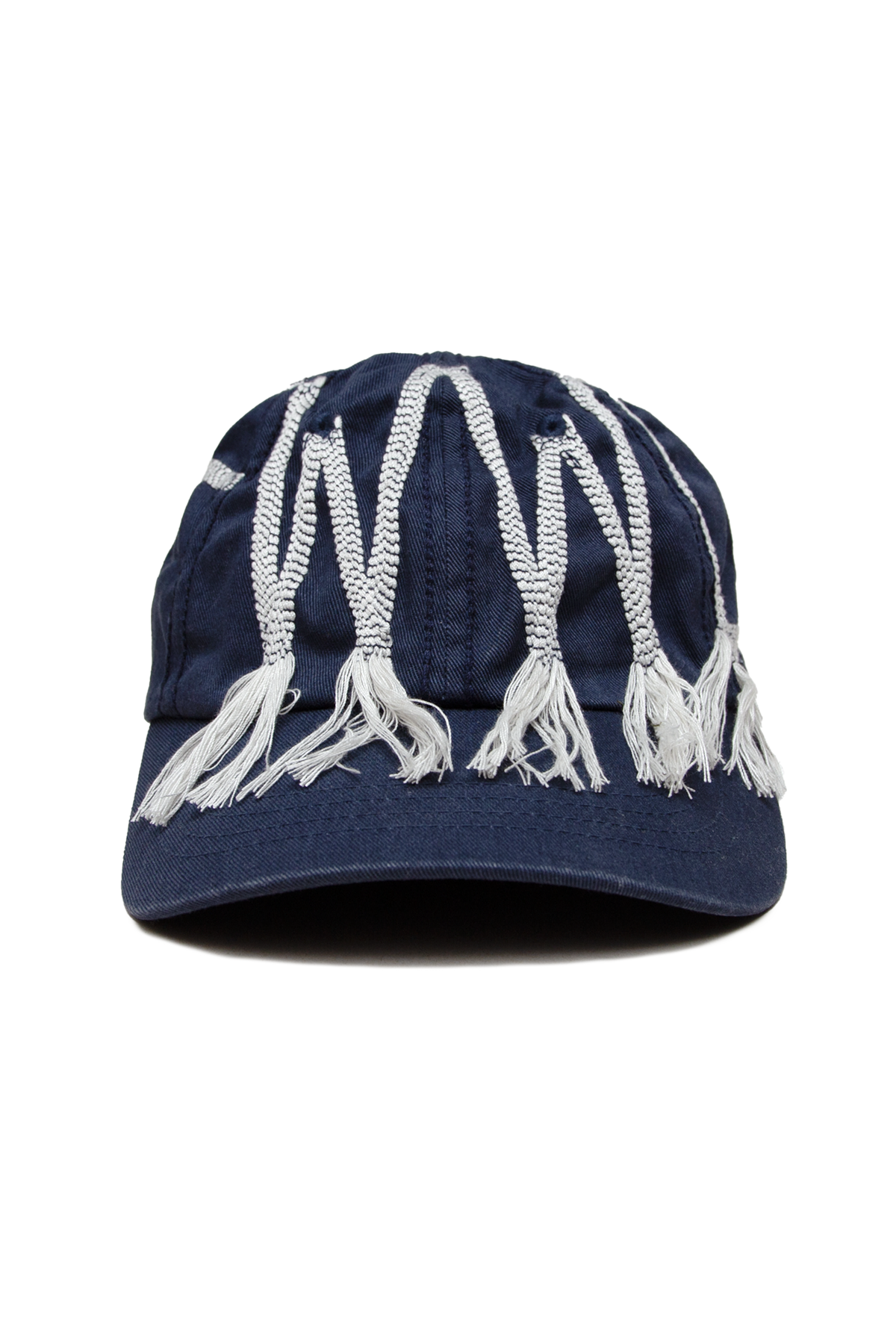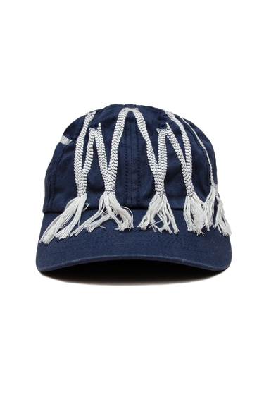 The FWWD Decon Classic Cap is a traditional 6-panel cap that features highly intricate hand-stitched details. FWWD (standing for Fortune WWD) is hand-stitched across the front of the cap in bundled white thread that hangs loose out the bottom of each letter, adding extra texture and flair to the cap. The seams of the cap are also hand-stitched with a thick, navy thread for added texture, and the light blue stitching of the inside label is also left loose on the back of the cap.
