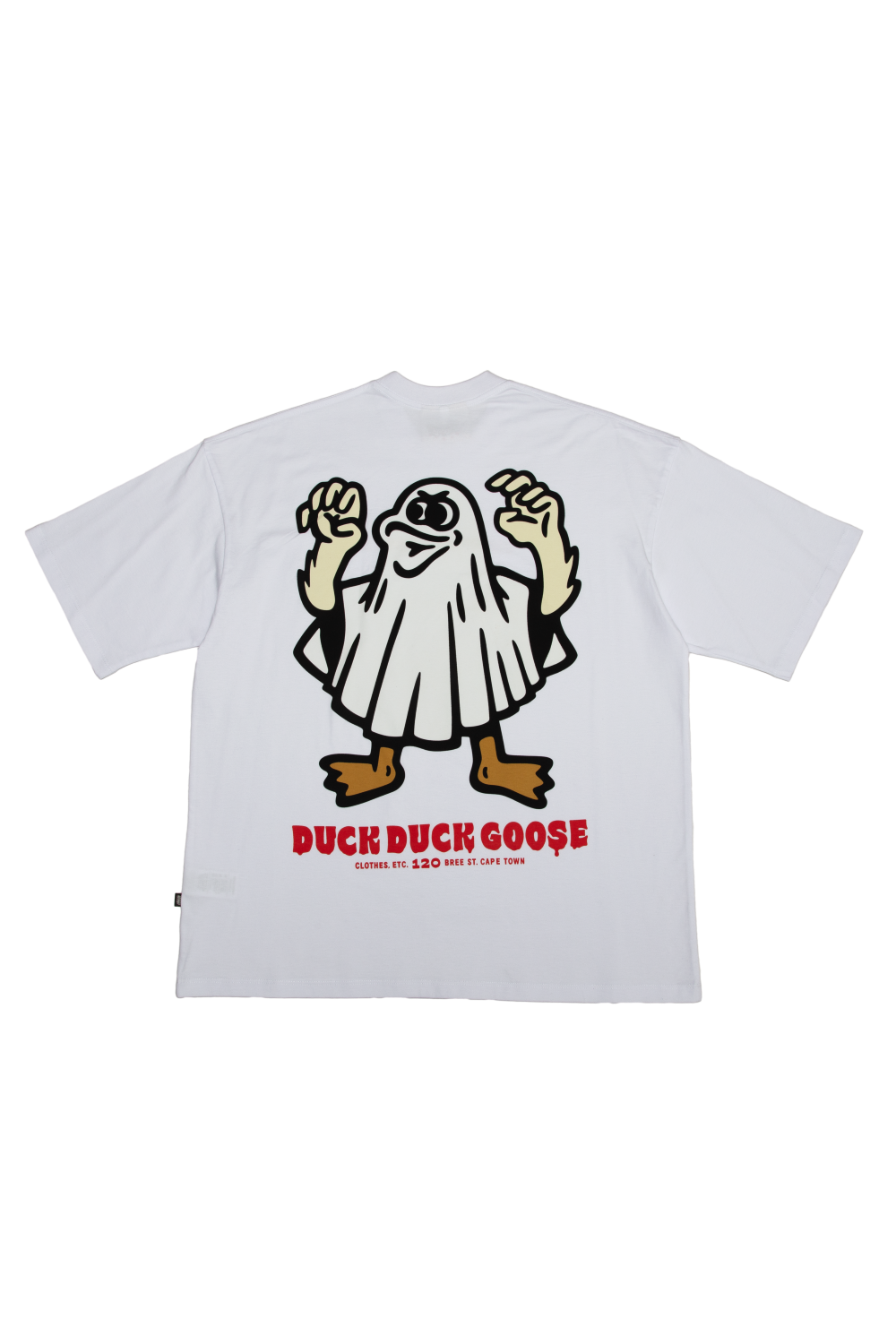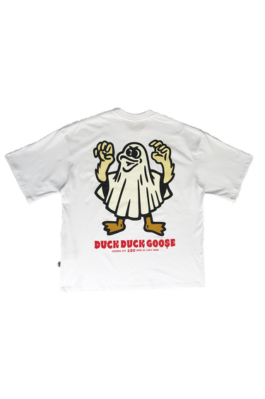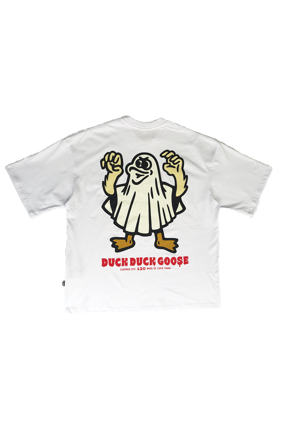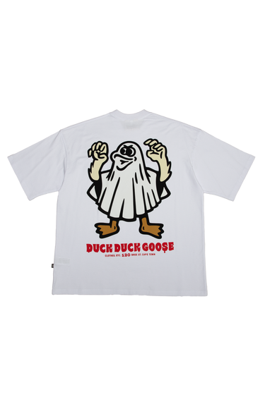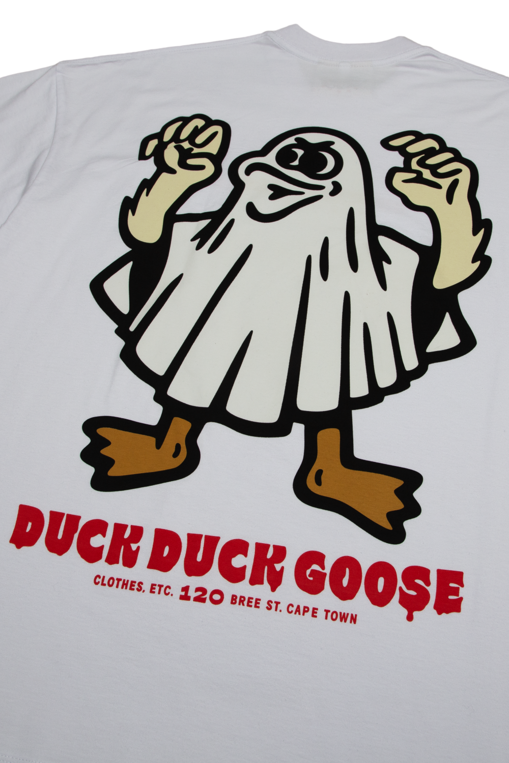 The Spoek Duck T-Shirt is Duck Duck Goose’s first ever Halloween-themed T-shirt. This Halloween, our duck’s gone for the old sheet over the head trick, illustrated by Shaun Hill. To make it real spooky, we’ve screen-printed the sheet in glow-in-the-dark ink on the back of the tee. The front of the T-shirt features our wordmark logo screen-printed in a limited edition droopy blood typeface.